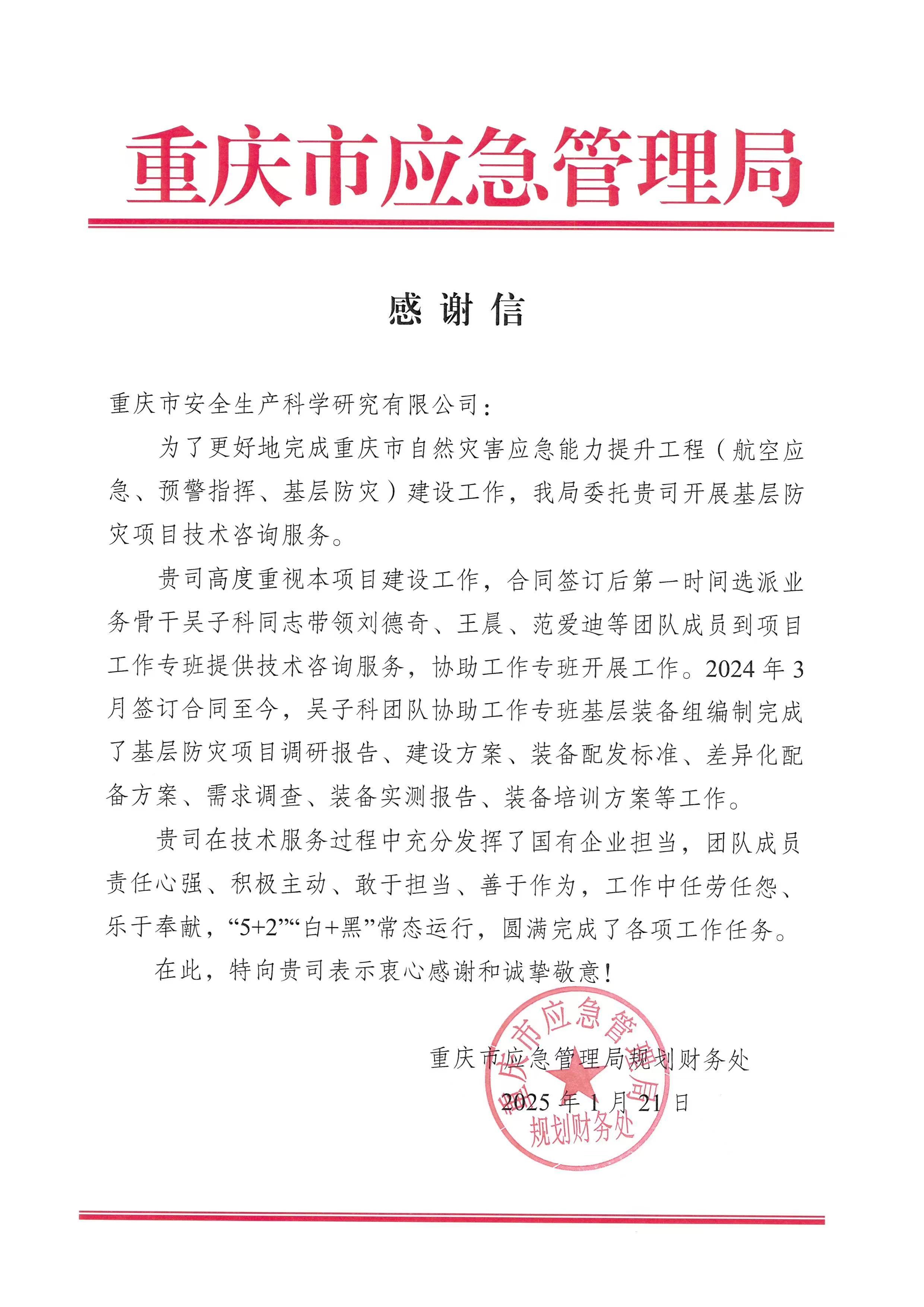重慶市應急管理局就國債項目技術支撐服務工作向公司致